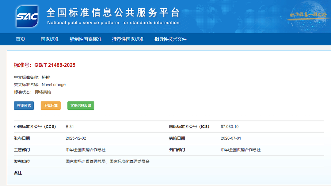 据悉,国家市场监督管理总局(国家标准化管理委员会)近日发布2025年第33号公告,批准《脐橙》(GB/T21488-2025)等261项推荐性国家标准。新版《脐橙》国标是对2008年版的首次修订。
