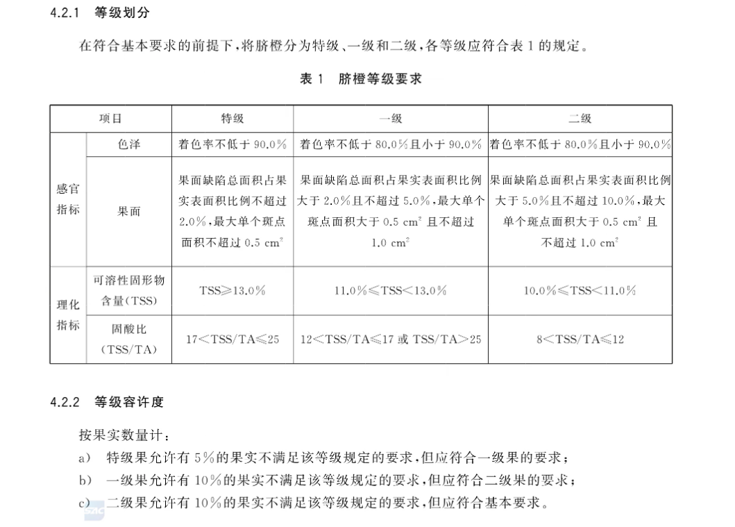 最新发布的标准明确:将脐橙分为特级、一级和二级。从色泽上来分:特级着色率不低于90.0%;一级着色率不低于80.0%且小于90.0%;二级着色率不低于80.0%且小于90.0%。从果面上来看:特级果面缺陷总面积占果实表面积比例不超过2.0%,最大单个斑点面积不超过0.5cm²;一级果面缺陷总面积占果实表面积比例大于2.0%且不超过5.0%,最大单个斑点面积大于0.5cm²且不超过1.0cm²;二级果面缺陷总面积占果实表面积比例大于5.0%且不超过10.0%,最大单个斑点面积大于0.5cm²且不超过1.0cm²。