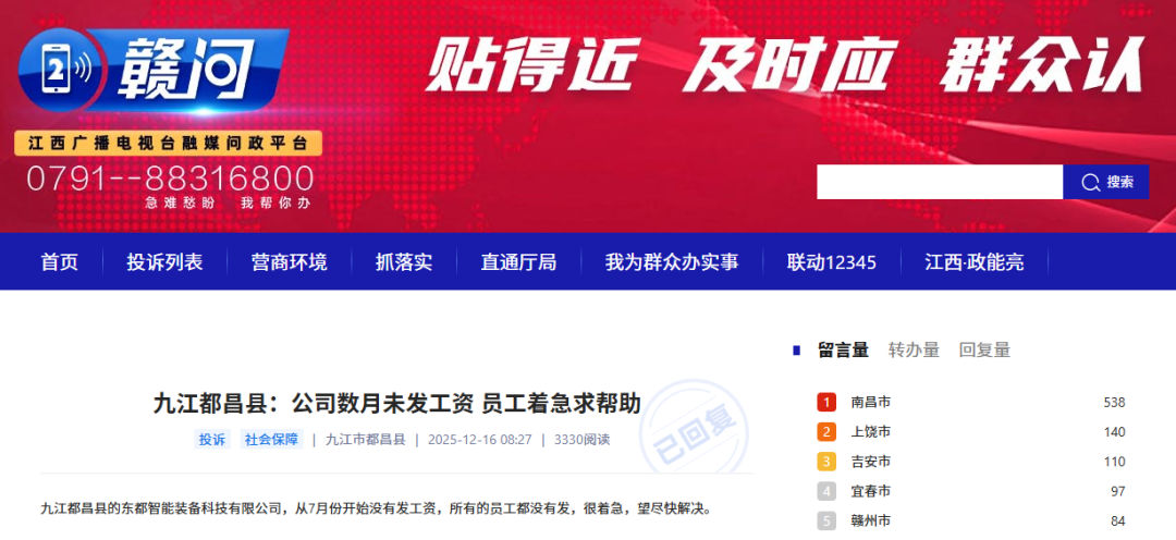《赣问》平台转来的《九江都昌县:公司数月未发工资 员工着急求帮助》已收悉。