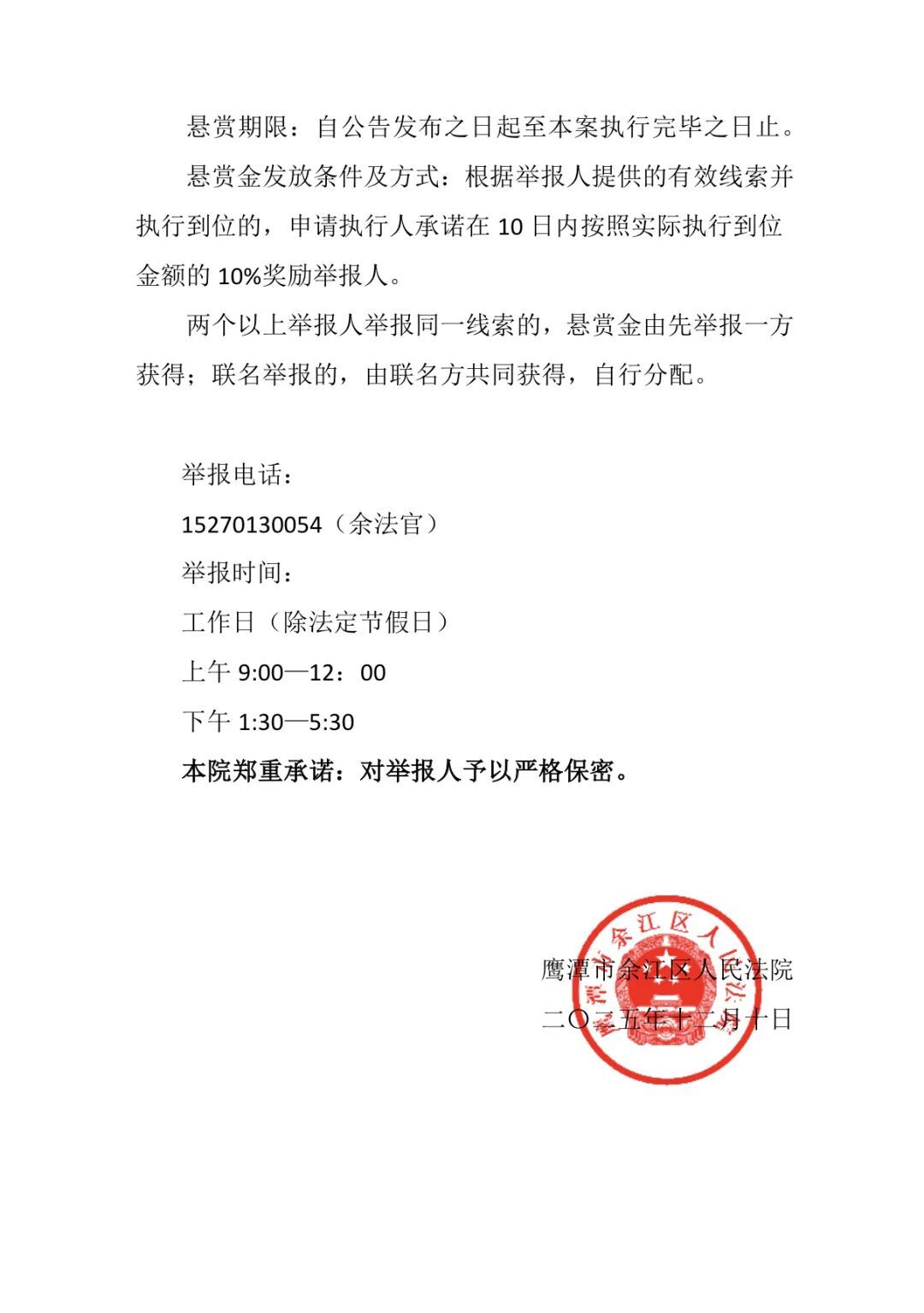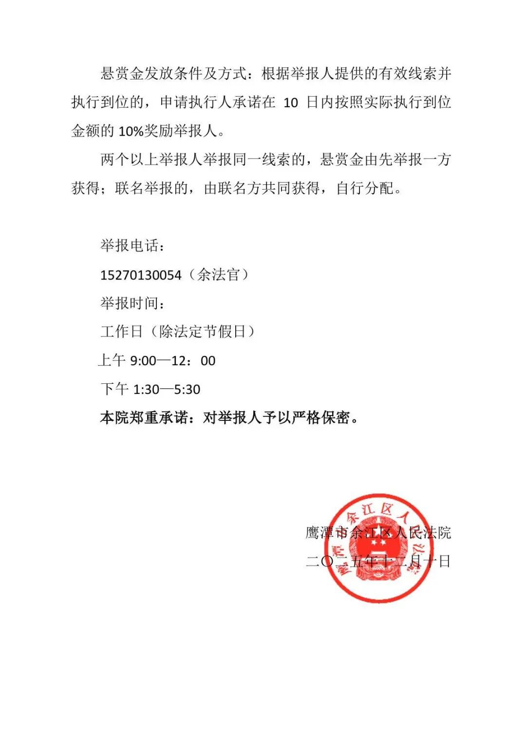 悬赏金发放条件及方式:根据举报人提供的有效线索并执行到位的,申请执行人承诺在 10 日内按照实际执行到位金额的10%奖励举报人。