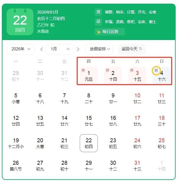 2026年元旦假期为1月1日(星期四)至1月3日(星期六),共3天。1月4日(星期日)上班。放假调休千万别记错上班时间