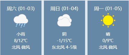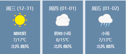 元旦期间以小雨天气为主,气温较低,注意防寒保暖。