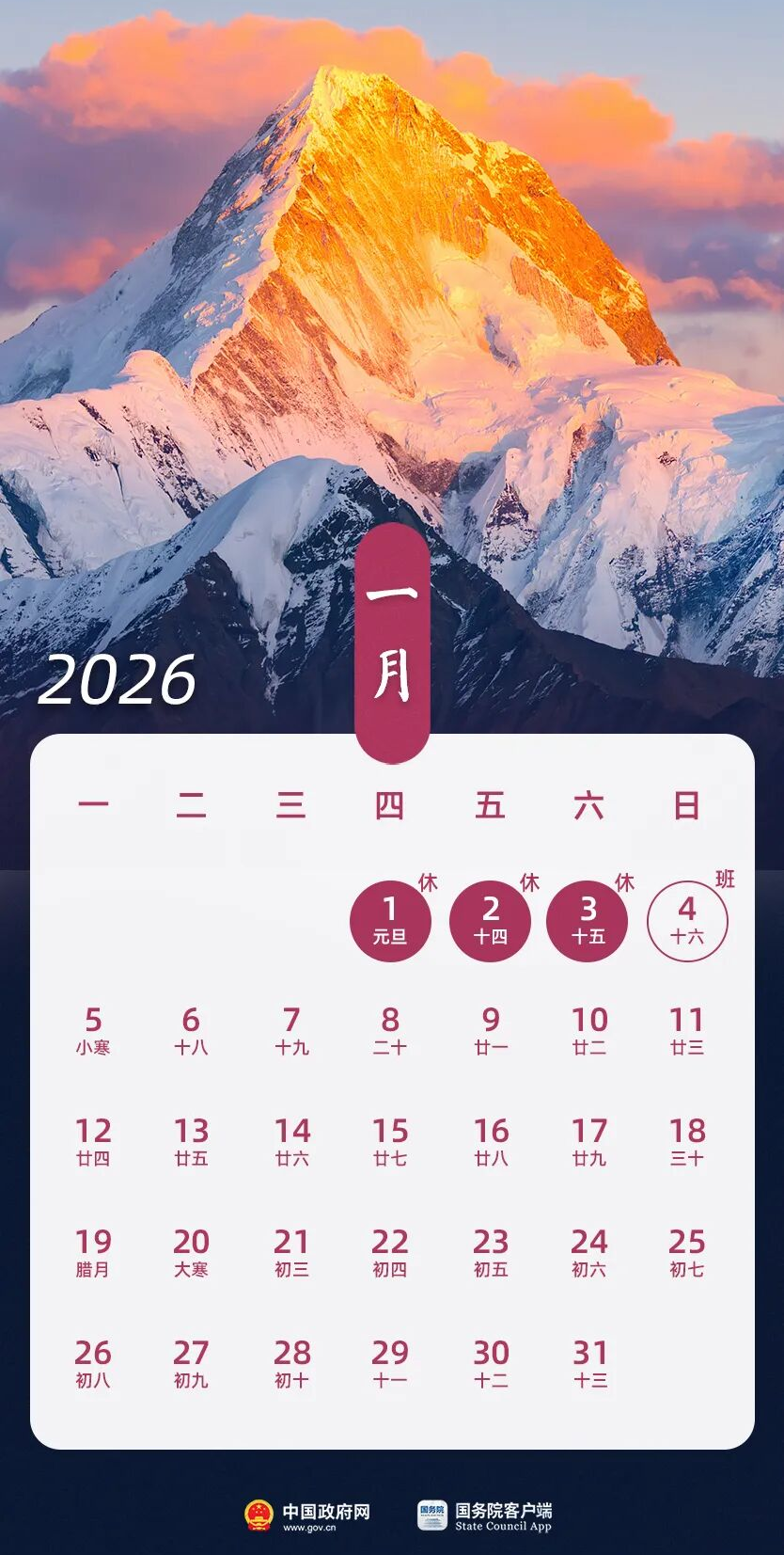 放假时间:2026年1月1日(周四)至3日(周六)放假调休,共3天。1月4日(周日)上班。