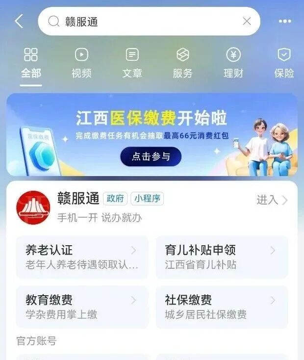 1.在应用市场下载“赣服通”APP或在支付宝搜索“赣服通”小程序进入平台。
