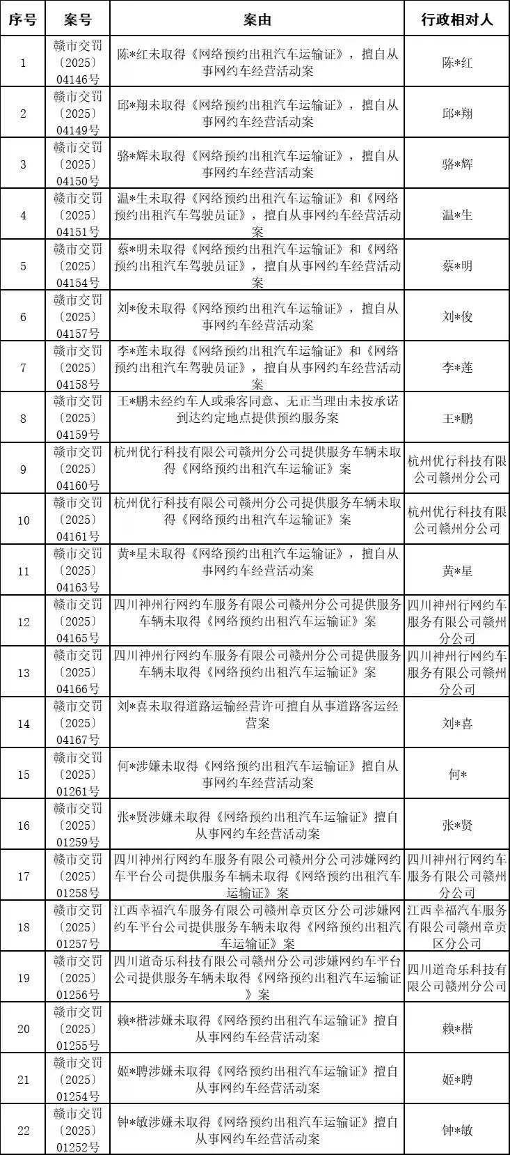 近期,赣州市交通运输综合行政执法支队聚焦出租车、网约车行业乱象,深入开展赣州市中心城区出租车服务质量和安全生产集中整治工作,现就查处的22起典型违规案例予以曝光,请全市道路运输经营者及从业者引以为戒,各网约车平台公司也要切实履行主体责任,加强对公司旗下营运车辆和从业人员管理,依法合规经营,共同维护良好的道路运输市场秩序。