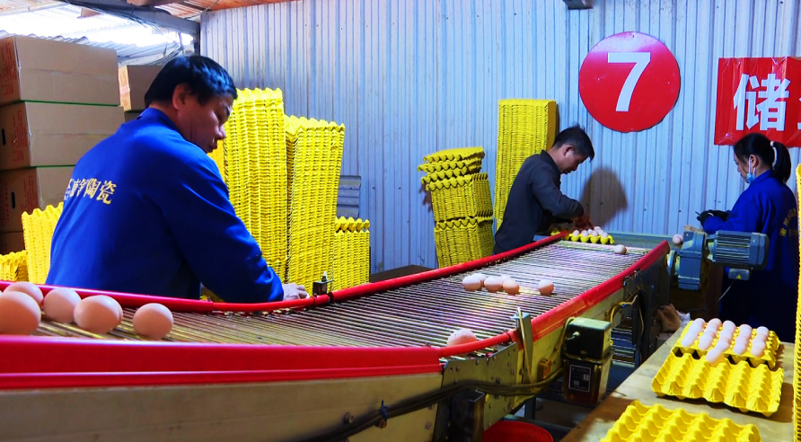 层叠式鸡笼整齐排列,全自动传输带将新鲜鸡蛋平稳送向分拣区,工人只需专注分拣装箱。“以前常年在外打工,现在家门口上班,每月能挣3000多块,工作稳定又轻松。”正在捡蛋的村民张丽华笑呵呵地说道。