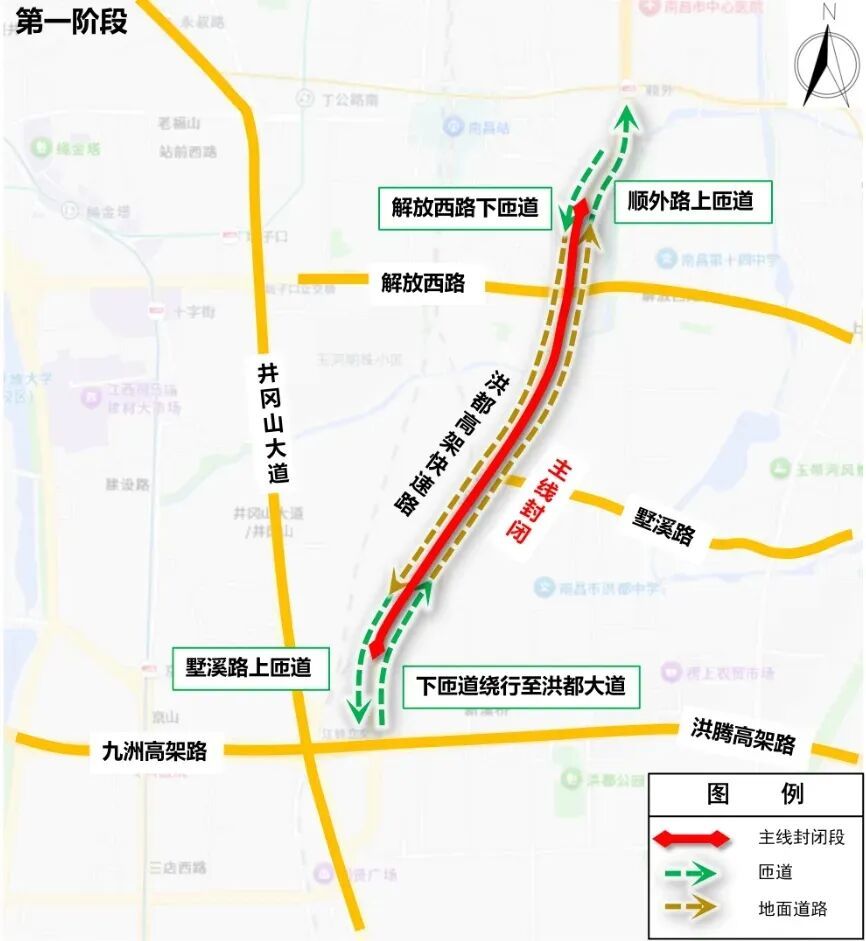 2.由南向北车辆可经墅溪路下匝道—洪都大道—顺外路上匝道通行。