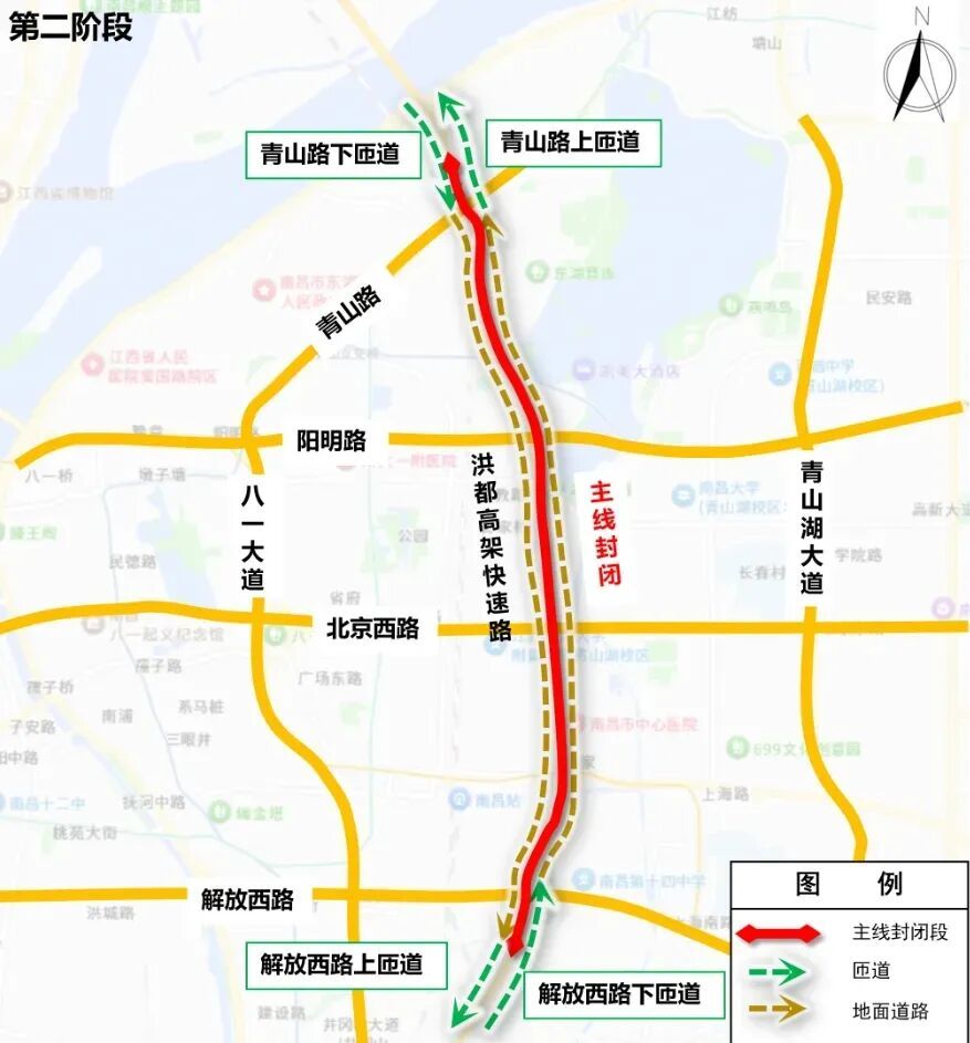 1.由北向南车辆可经青山北路下匝道—洪都大道—解放西路上匝道通行;