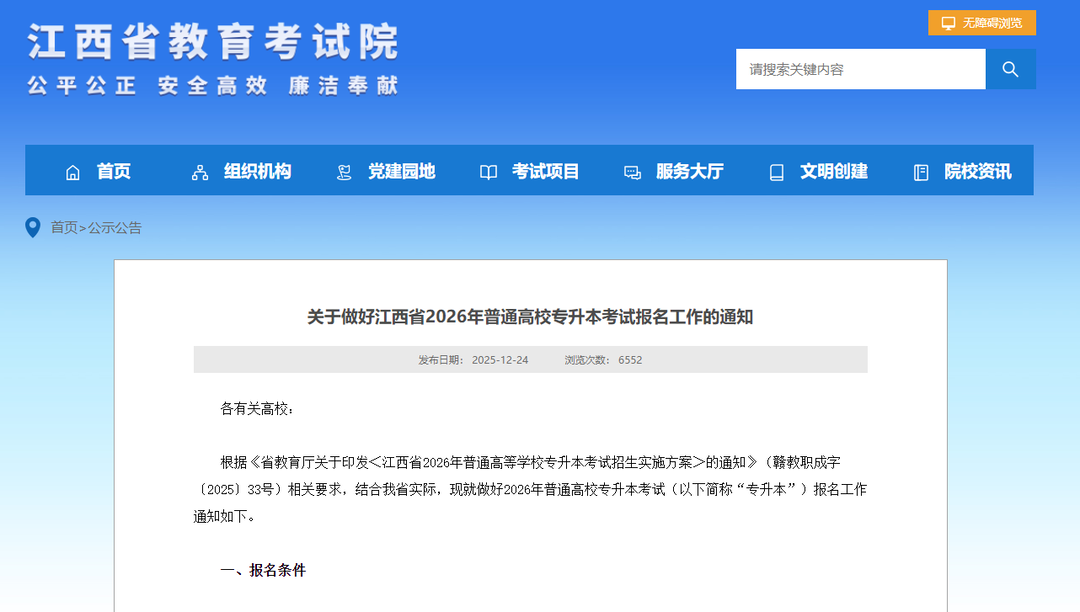 12月24日,江西省考试院发布《关于做好江西省2026年普通高校专升本考试报名工作的通知》,记者了解到,江西省2026年普通高校专升本考试招生报名工作将正式展开。网上报名通道于2026年1月6日9:00开启,至1月11日17:00关闭,逾期不予补报。