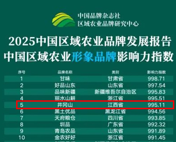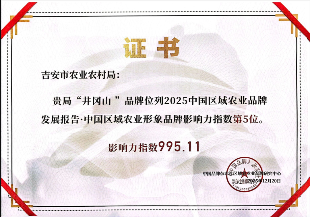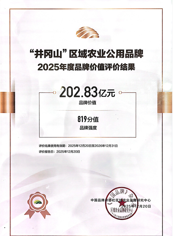 12月24日,记者从相关部门获悉,由中央驻京新闻媒体《中国品牌》杂志、中国品牌网主办的“2025区域农业品牌年度盛典”系列活动在北京举行。会上发布了“2025中国区域农业形象品牌影响力指数”,我市“井冈山”农产品区域公用品牌斩获2025中国区域农业形象品牌影响力指数第5位,品牌价值达202.83亿元。