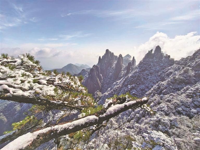 12月24日晚,受强冷空气影响,三清山迎来了今冬的第一场降雪。山峰、栈道、树林和草地,都覆盖上了一层厚厚的积雪,整座山峰被装扮一新,宛如童话世界。