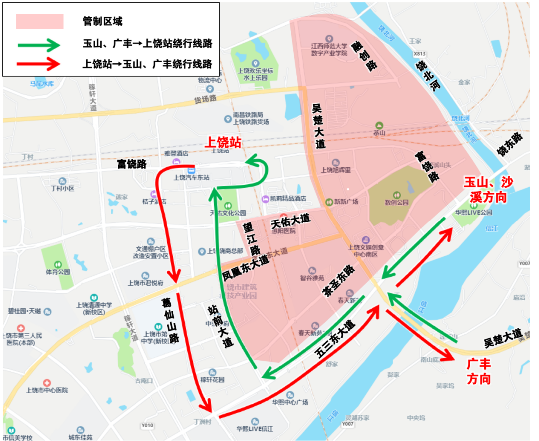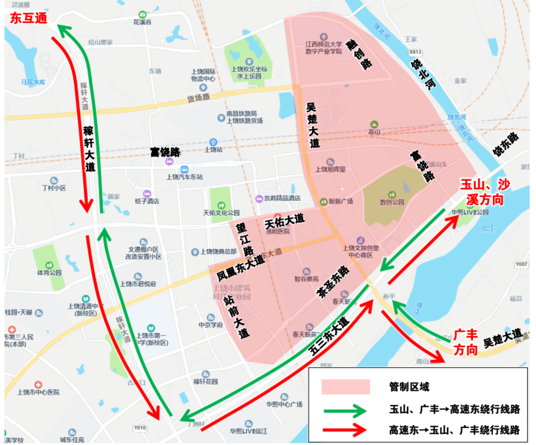 管制区域:五三东大道(不含)——站前大道(东半幅)——凤凰东大道——望江路——天佑大道(南半幅)——吴楚大道——融创路——饶北河合围区域内所有道路。