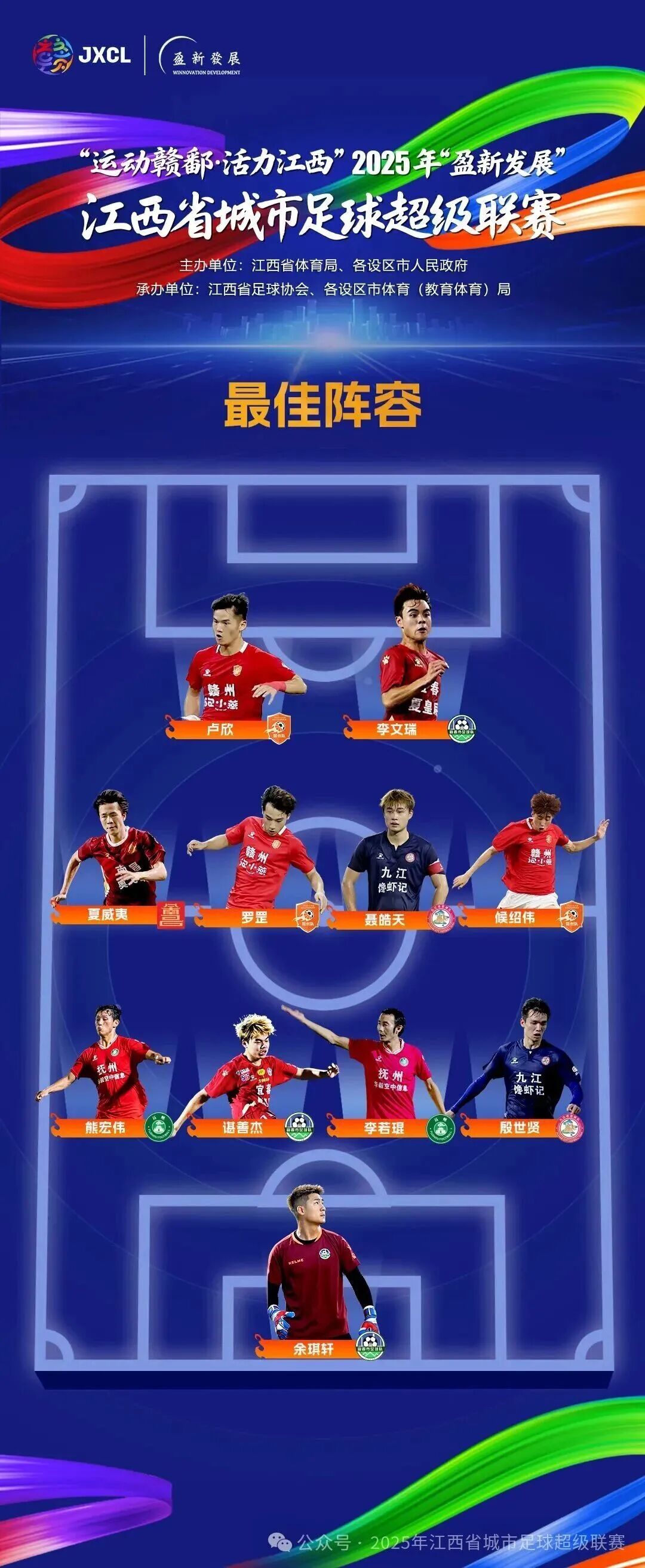 12月26日,记者从江西省足球协会获悉,为激励联赛中表现突出的运动员,树立竞技典范,弘扬体育精神,依据《2025年江西省城市足球超级联赛竞赛规程》相关规定,经各参赛队推荐,评审小组从球员上场时间、技战术表现和体育道德风尚等方面进行综合评审,最终确定本届联赛“最佳阵容”名单。具体名单如下: