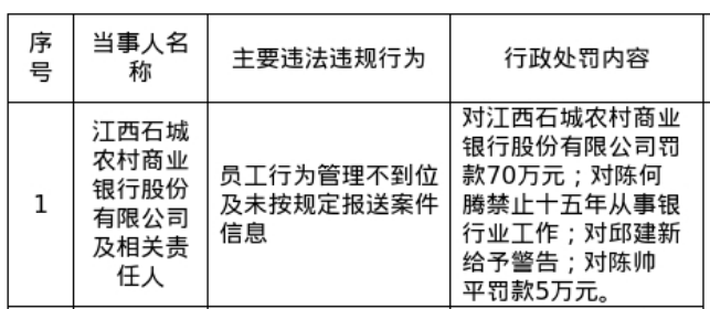针对上述违法违规行为,国家金融监督管理总局赣州监管分局对其罚款70万元;对陈何腾禁止十五年从事银行业工作;对邱建新给予警告;对陈帅平罚款5万元。