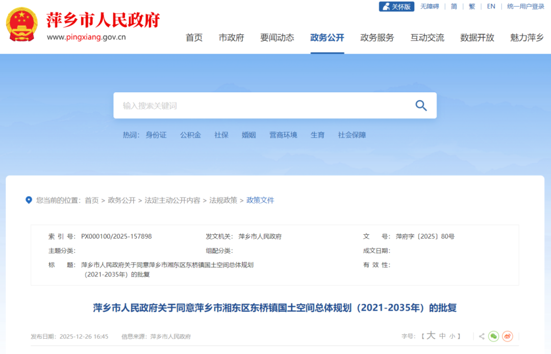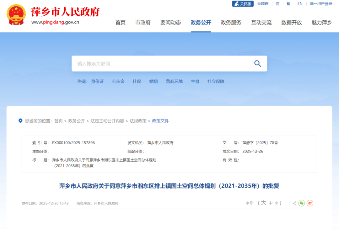 《关于批准萍乡市湘东区排上镇国土空间总体规划(2021-2035年)的请示》(湘府文〔2025〕60号)收悉。现批复如下: