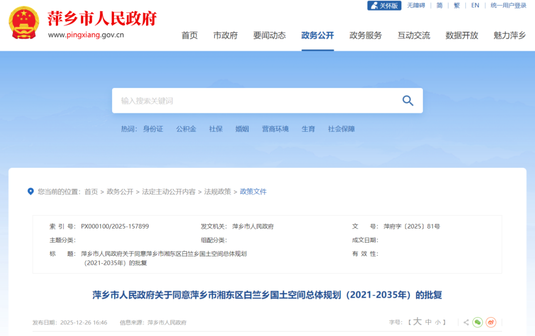 《关于批准萍乡市湘东区白竺乡国土空间总体规划(2021-2035年)的请示》(湘府文〔2025〕64号)收悉。现批复如下: