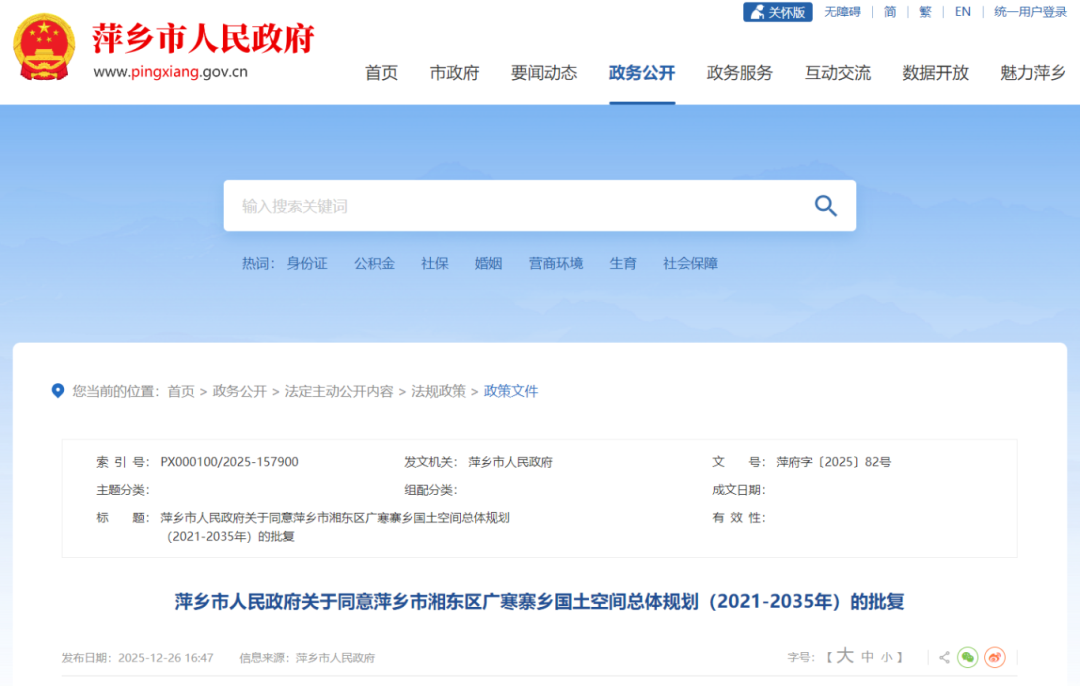 《关于批准萍乡市湘东区广寒寨乡国土空间总体规划(2021-2035年)的请示》(湘府文〔2025〕61号)收悉。现批复如下:
