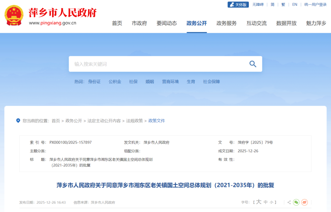 《关于批准萍乡市湘东区老关镇国土空间总体规划(2021-2035年)的请示》(湘府文〔2025〕62号)收悉。现批复如下: