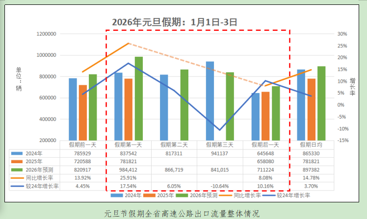 预计假期全省高速出口总车流量约269.21万辆,日均89.74万辆,较2025年元旦单日流量同比增长14.78%。其中,客车日均流量69.95万辆,货车及专项作业车日均流量19.79万辆。