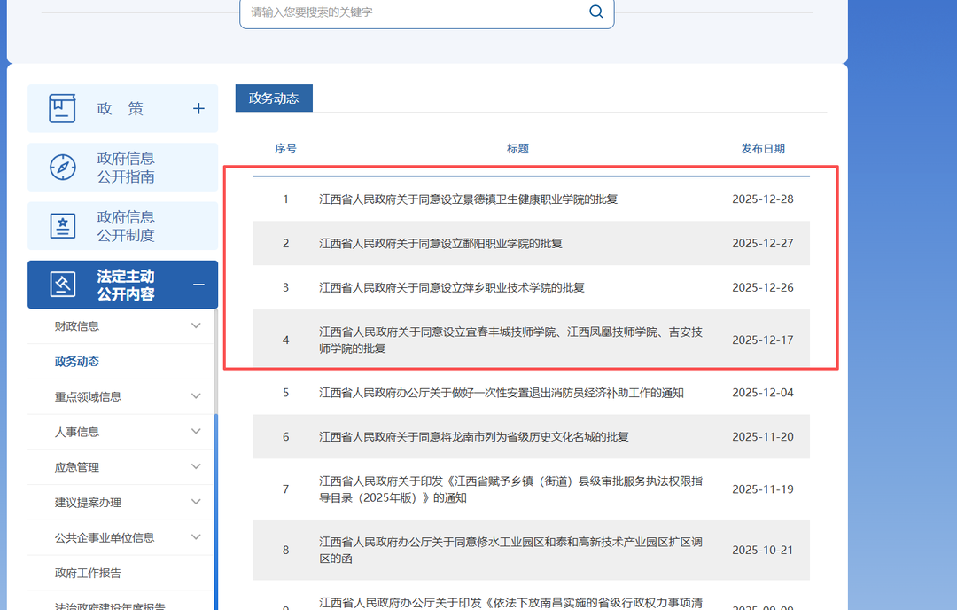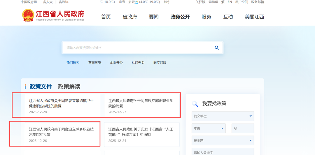 12月26日至28日,江西省政府连续公布三份同意批复文件,分别是《关于同意设立景德镇卫生健康职业学院的批复》《关于同意设立鄱阳职业学院的批复》和《关于同意设立萍乡职业技术学院的批复》。