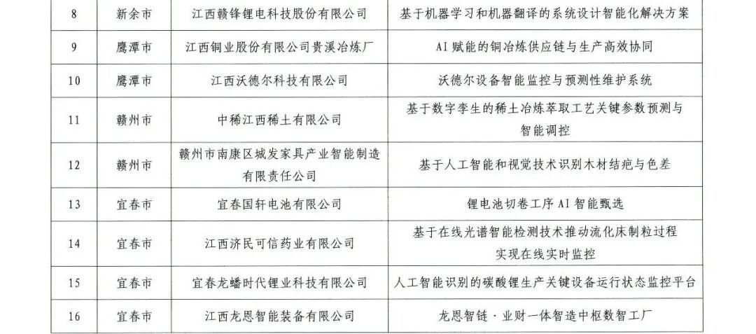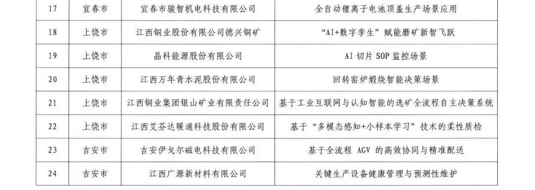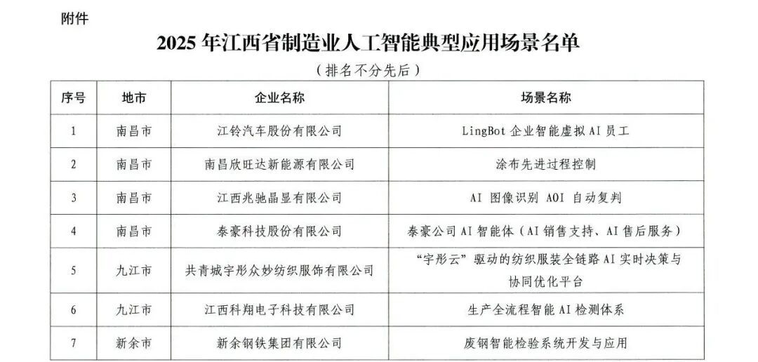 根据《江西省工业强省建设工作领导小组关于印发江西省人工智能与制造业数字化转型协同实施方案的通知》(赣工强省小组字〔2025〕3号)《关于组织开展 2025年江西省制造业人工智能典型应用场景征集工作的通知》,经场景征集、各设区市工信局审核推荐、专家评审、现场核查、重点抽查、厅长办公会审议和公示等程序,将24个人工智能场景纳入《2025年制造业人工智能典型应用场景名单》,现予以公布。