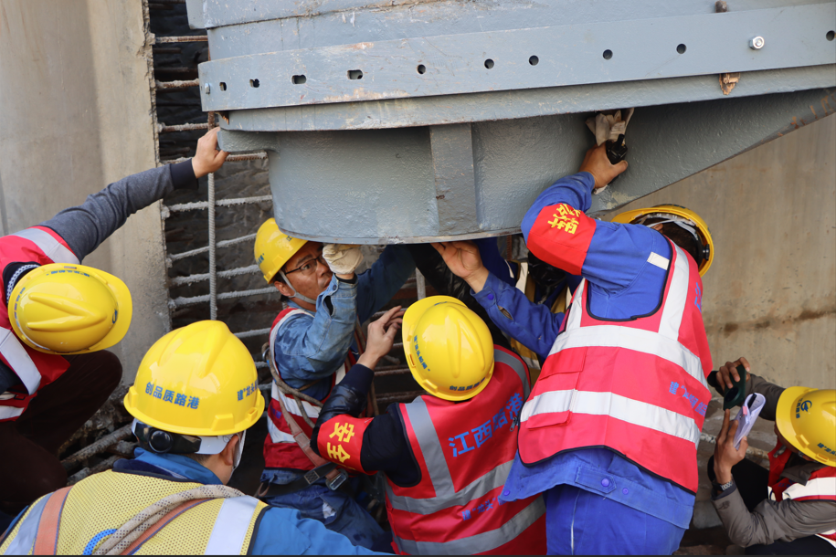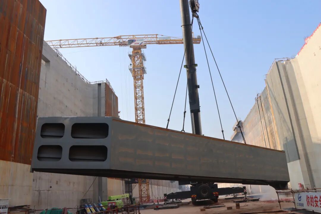 此次吊装工作不仅效率突出,精准度也达到预期标准。在14节门体的运输、吊装与拼接全过程中,施工团队借助激光定位、实时监测等先进技术,全程把控门体安装的垂直度、平整度和对接精度,每一节门体的吊装落位误差均控制在毫米级,有效保障了后续门体的密封性能与运行稳定性。从首节门体吊装到最后一节精准落位,整个下闸首人字门吊装工作较原计划提前完成,以实际行动诠释了“高效施工、精准建造”的建设理念。