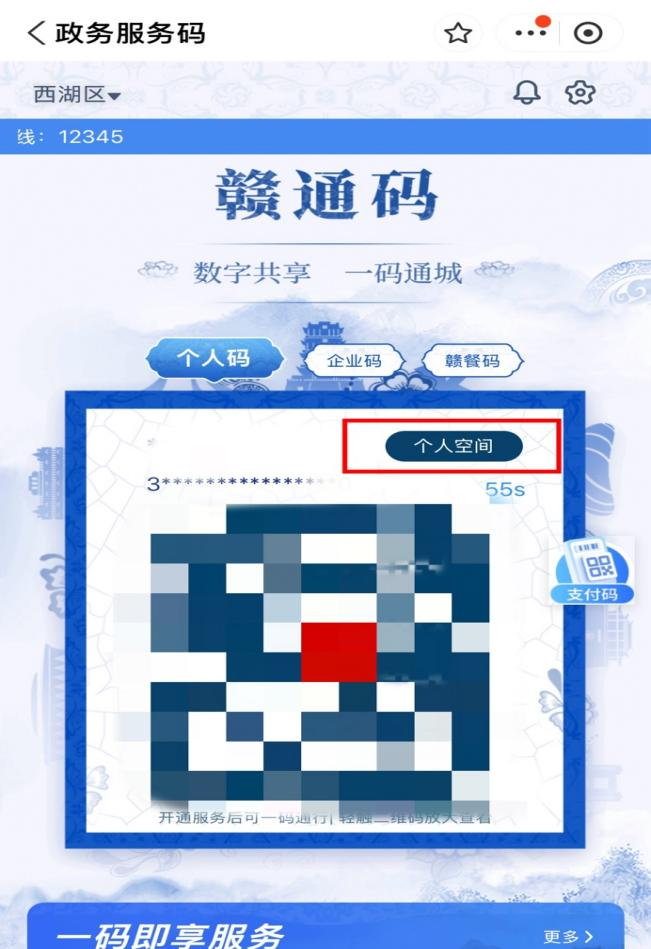 2、打开“赣服通”后,点击“赣通码”,再点击“个人空间”。