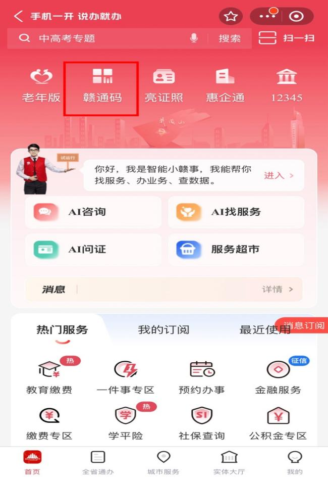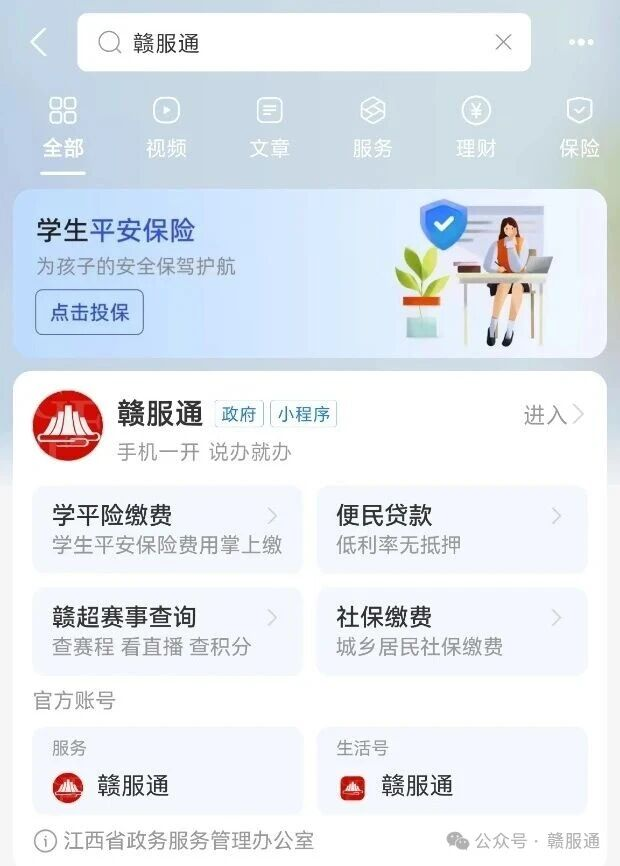 1、在应用市场下载“赣服通”APP或在支付宝搜索“赣服通”小程序进入平台。