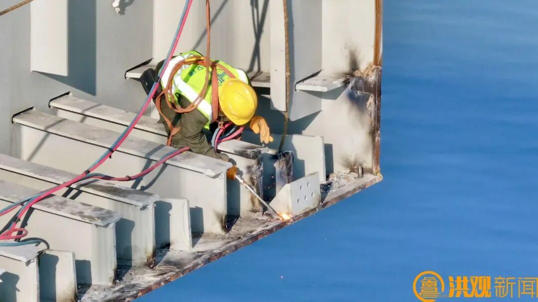 12月28日中午,运载着大桥最后两段中跨钢箱梁的船只停泊到位,工人上船安装绳索,正式起吊。吊装过程中,需要进行多次悬停配切施工。12月29日晚,施工方进行了最后的配切、吊装,完成合龙。