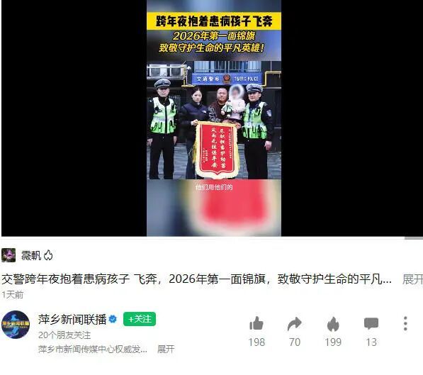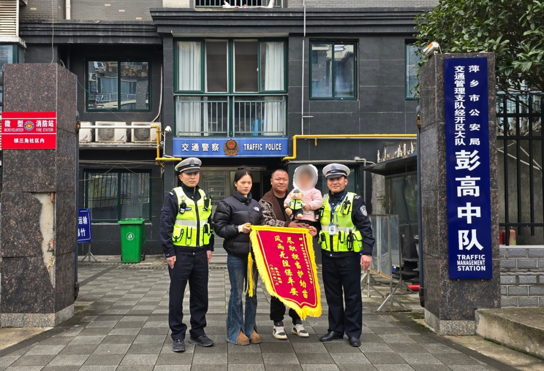 跨年夜的紧急救援虽已落幕,温情却在延续。2026年1月2日中午,跨年夜在天虹路段求助的陈先生专程前往萍乡市公安局交管支队经开区大队,将一面锦旗送到经开大队交警巫家军手中,感谢他在跨年夜里的紧急救助。从雨夜狂奔到锦旗致谢,巫家军以初心践行使命,用实际行动诠释了“哪里有困难,哪里就有人民警察”的铮铮誓言。