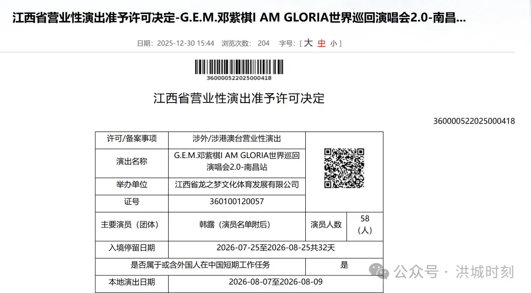 此外,G.E.M.邓紫棋I AM GLORIA世界巡回演唱会2.0-南昌站将于2026年8月7日~2026年8月9日举行,演出场所位于江西省南昌市红谷滩区三清山大道333号南昌国际体育中心体育场,这也是邓紫棋时隔一年多后,再度来南昌开唱。