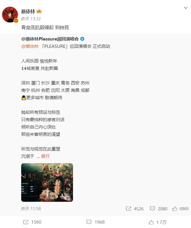 元旦当天,知名歌手蔡依林新巡演官宣14城,其中包括江西南昌(2026年7月11日),这也是时隔2年多后,蔡依林再度来南昌开唱。