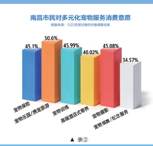 年轻化的宠主结构,直接推动了消费观念与市场格局的变革。他们不仅数量增多,更愿意为宠物的生活质量投资。本报调查显示,南昌宠主在宠物保险、乐园、训练、摄影等新兴服务项目上消费意愿强烈,超过50%的问卷填写者愿意为宠物选择乐园或旅游服务(见表2)。