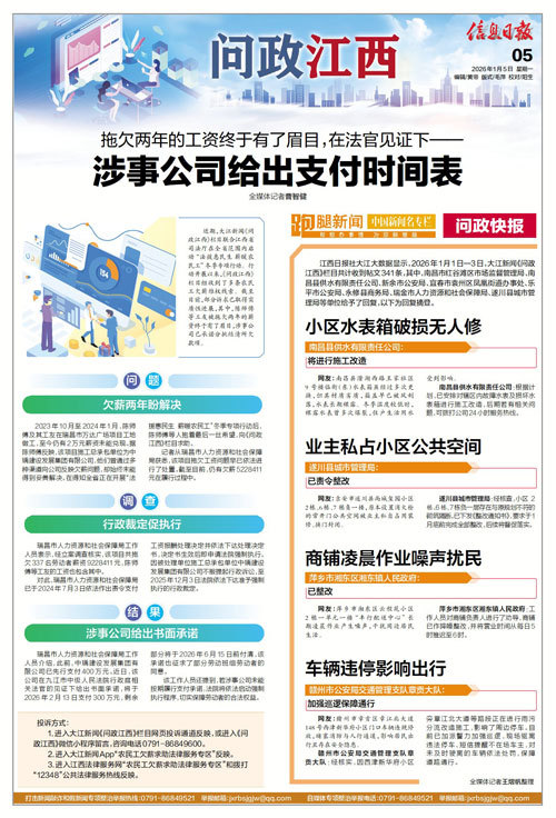 近期,大江新闻《问政江西》栏目联合江西省司法厅在全省范围内启动 “法援惠民生 薪暖农民工” 冬季专项行动。行动开展以来,《问政江西》栏目组收到了多条农民工欠薪维权线索。截至目前,部分诉求已取得实质性进展,其中,陈师傅等工友被拖欠两年的薪资终于有了眉目,涉事公司已承诺分批结清所欠款项。