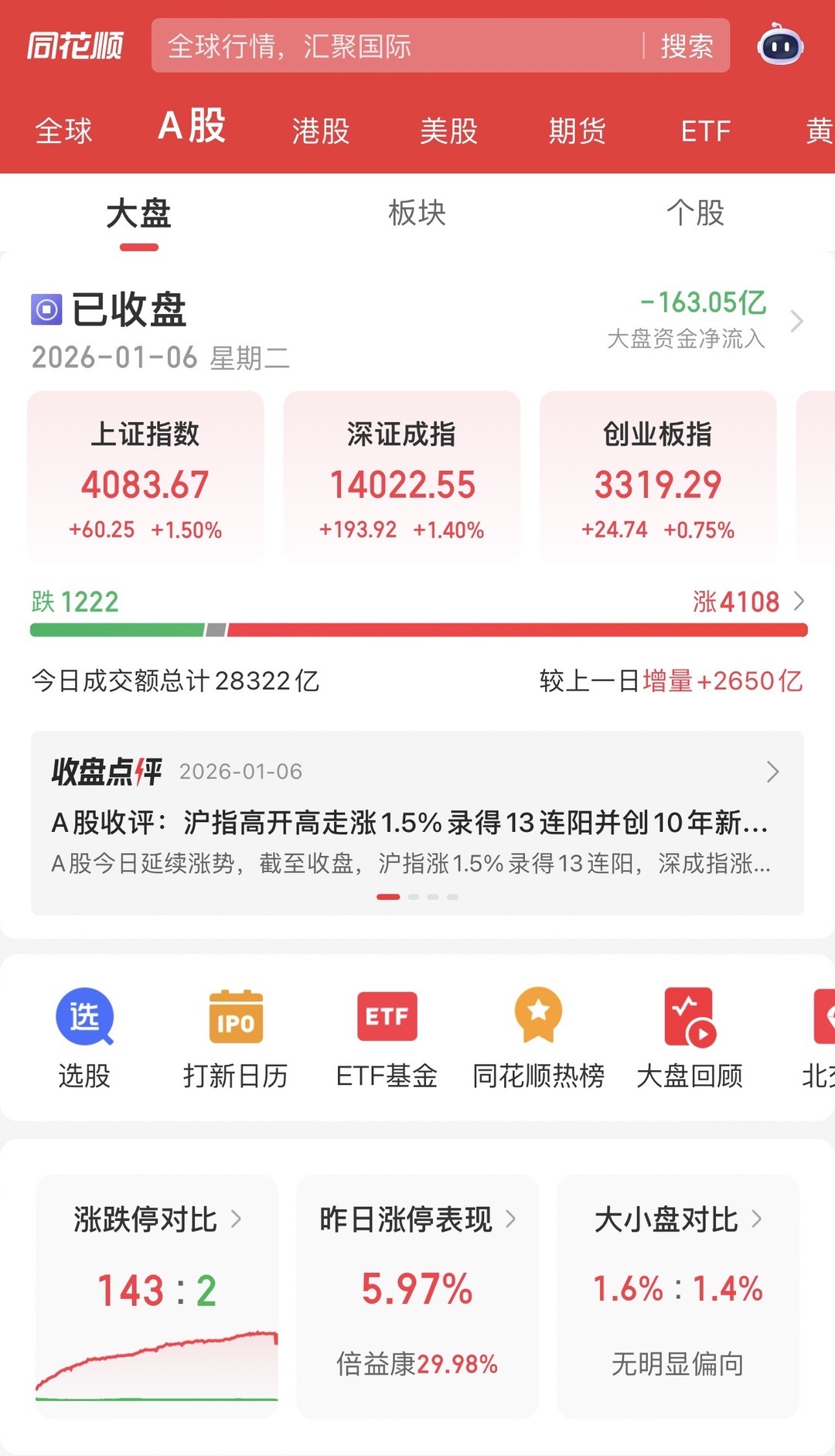 大江新闻讯 全媒体记者谢梦丽报道:1月6日,A股延续强势上涨态势,牛市氛围拉满!截至收盘,沪指大涨1.5%,强势斩获13连阳,深成指、创业板指、北证50指数分别上涨1.4%、0.75%、1.82%,全线飘红。