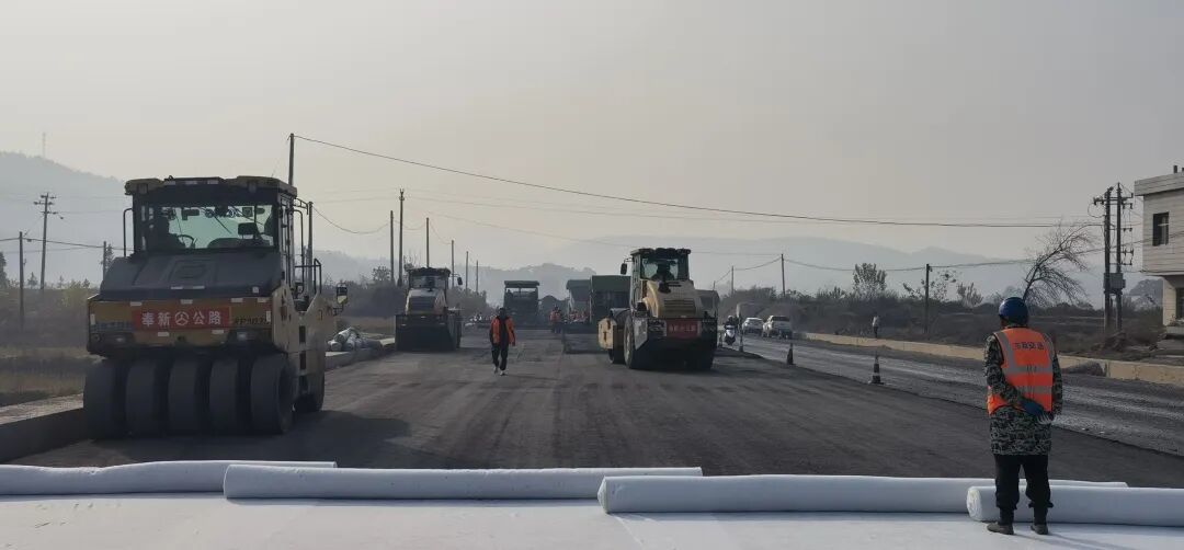 在工地上,沿着终点走向项目起点(上高县S221上蒙线X405路口附近),记者看到,路基已拓宽至25.5米,十多辆机车开足马力,工人们正忙着铺设碎石垫层、保湿膜。