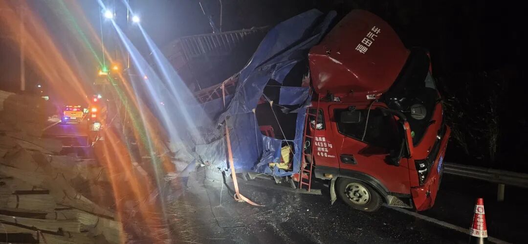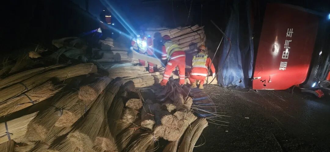 当日凌晨1时许,一辆满载竹条的重型货车行驶至沪昆高速昌金段K907公桩南昌方向时,因后轮爆胎发生侧翻,600余捆竹条瞬间散落于行车道及应急车道,道路通行随即中断。彼时深夜视线极差,极易引发二次事故,新田中队接警后火速抵达现场,第一时间完成安全布控,筑牢施救安全防线。2时30分,侧翻车辆所载竹条全部倒运完毕,吊车起吊作业随即展开;2时50分,侧翻货车成功扶正;3时10分,事故车辆被安全拖离,防护设施有序撤除,道路恢复正常通行。