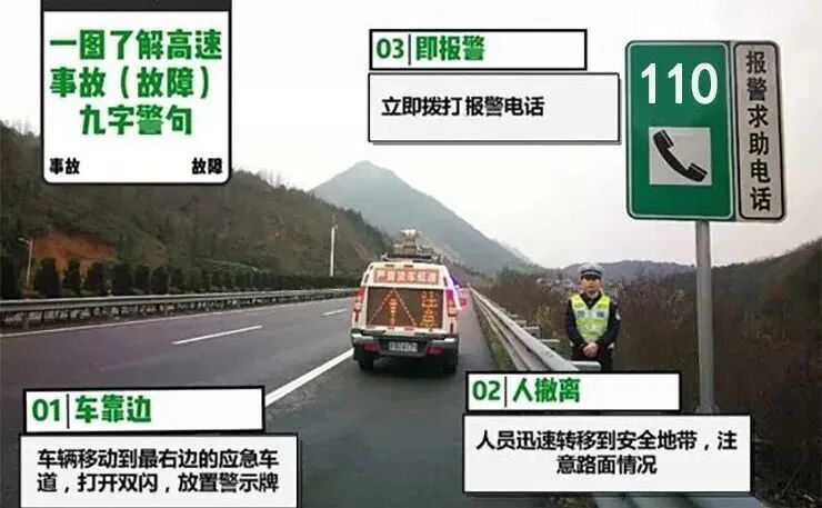 在高速公路上发生故障时,警告标志应当设置在故障车来车方向150米以外,牢记“九字诀”:车靠边、人撤离、即报警。