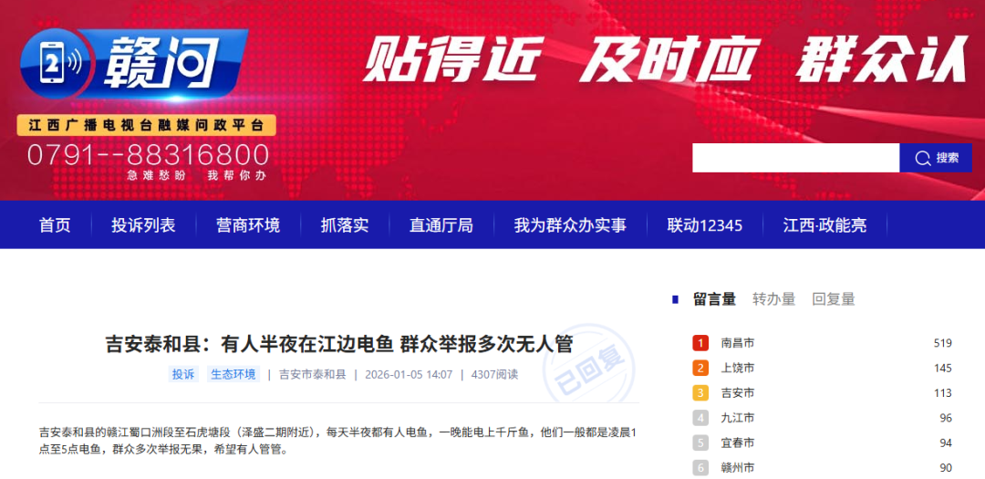 《赣问》平台转来的《吉安泰和县:有人半夜在江边电鱼 群众举报多次无人管》已收悉。