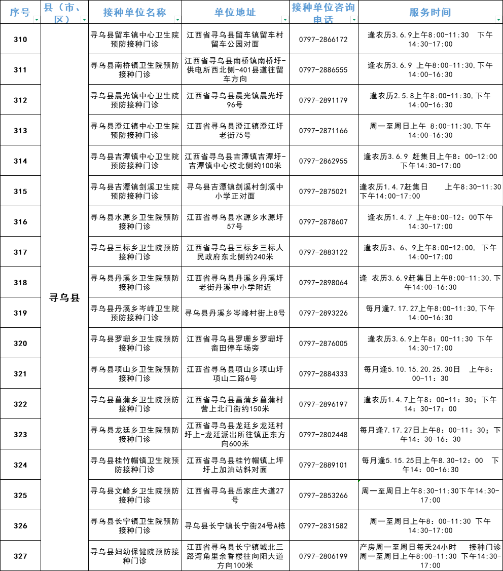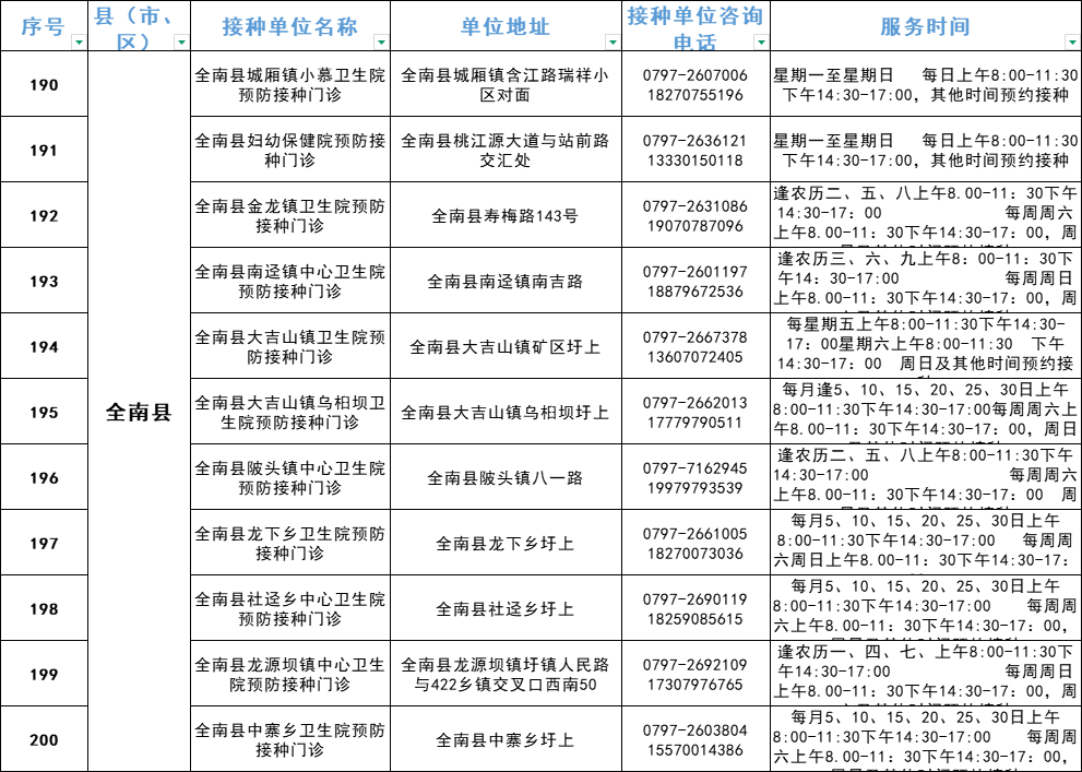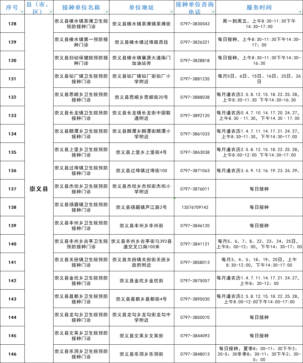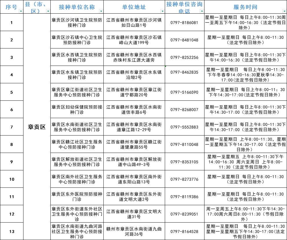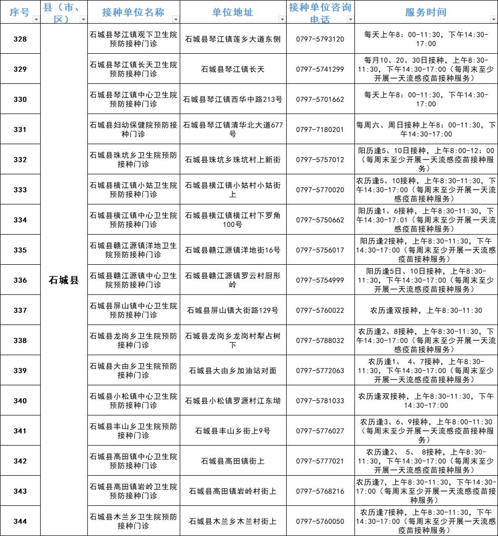 赣州市流感疫苗预防接种单位