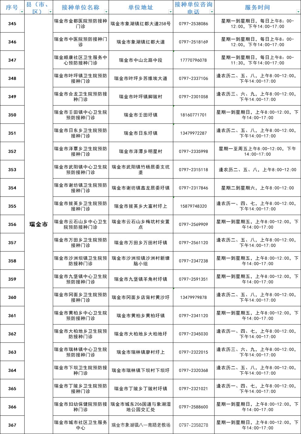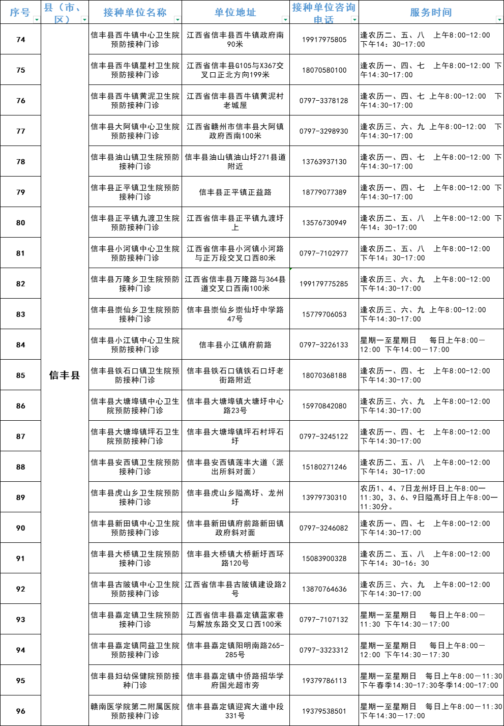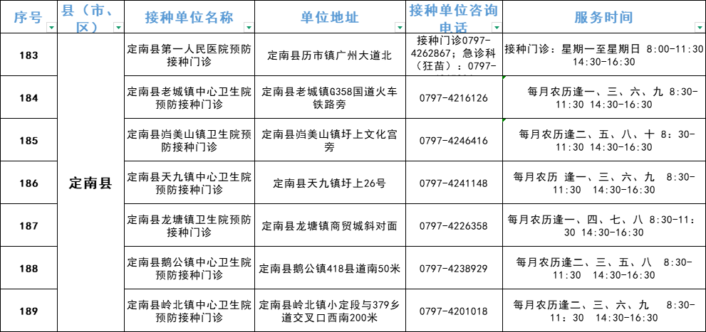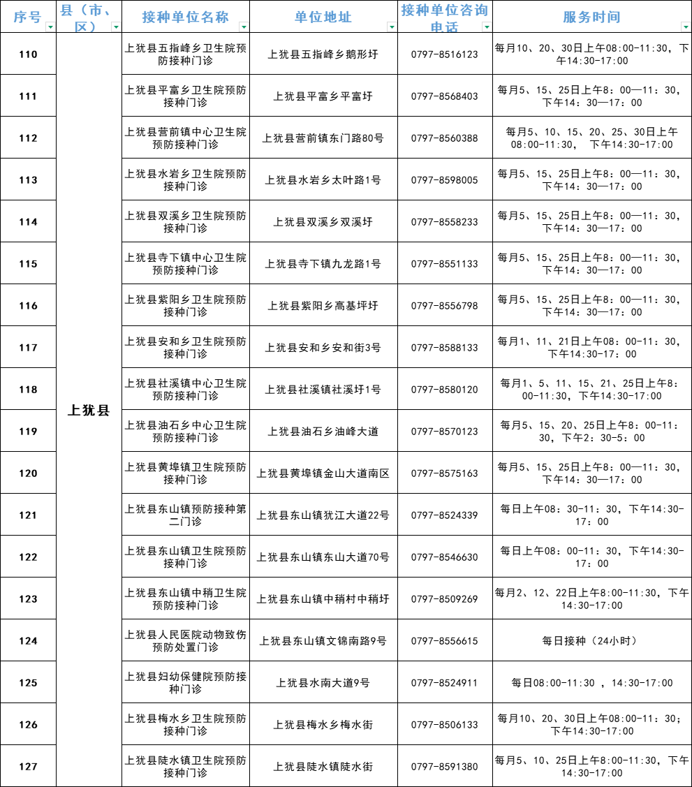 赣州市流感疫苗预防接种单位