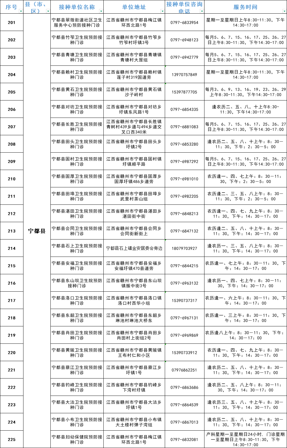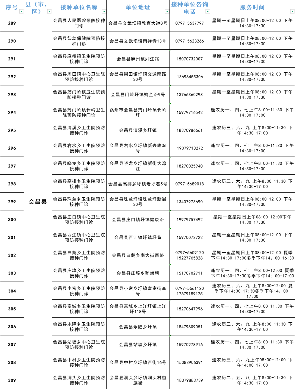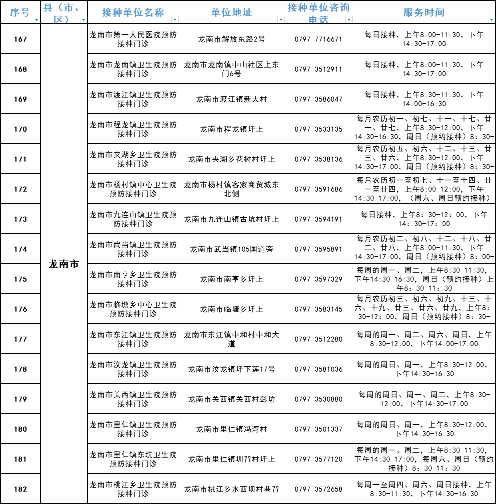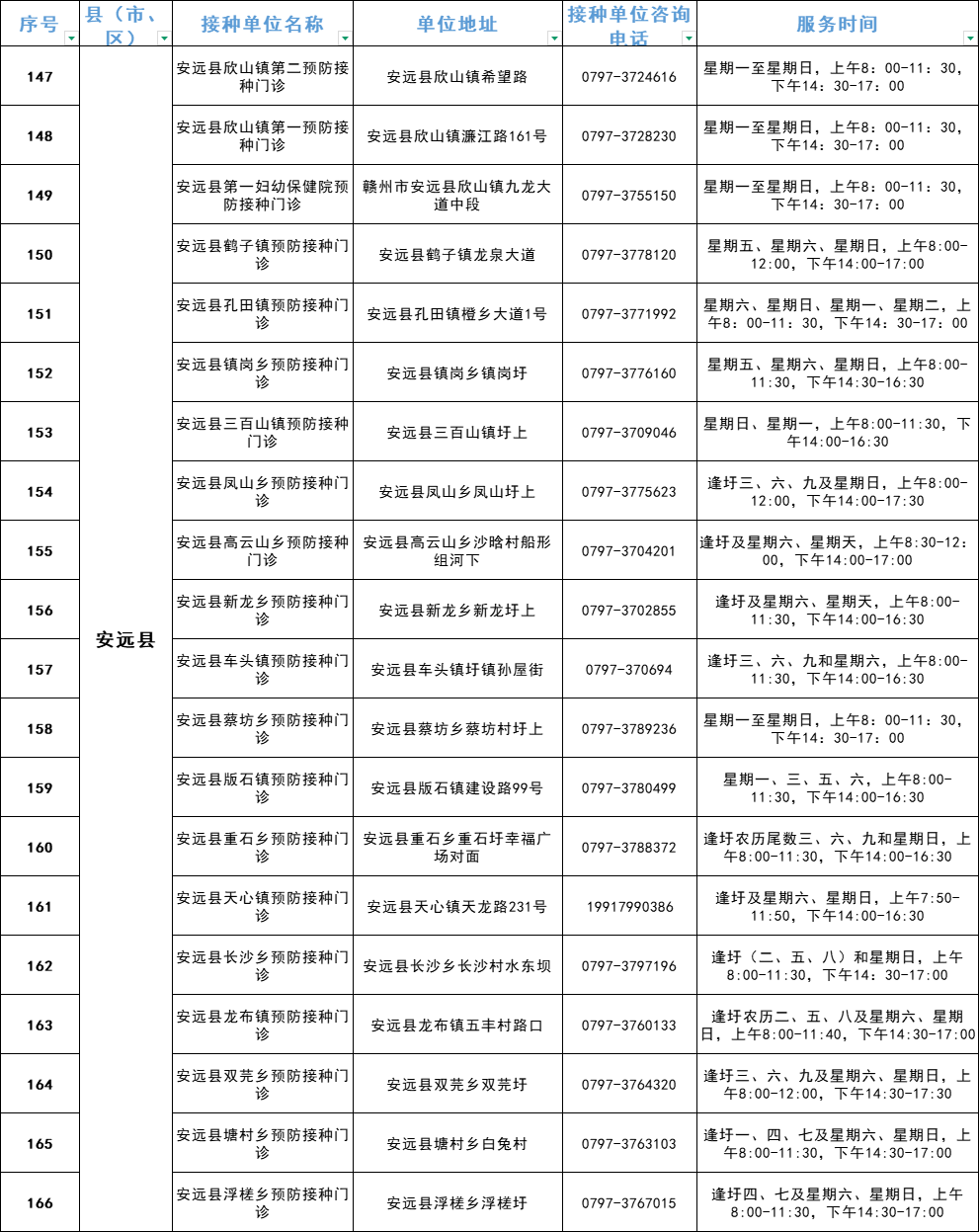 赣州市流感疫苗预防接种单位