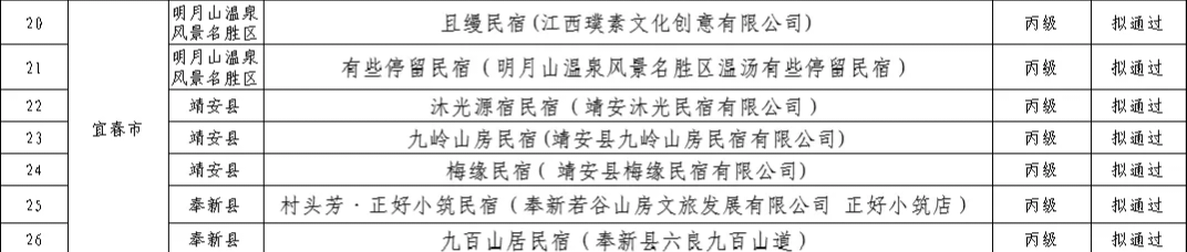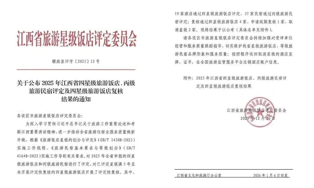 根据全国旅游标准化技术委员会正式公示的2025年全国甲级、乙级旅游民宿评定结果,以及江西省文化和旅游厅发布的《关于公布2025年江西省四星级旅游饭店、丙级旅游民宿评定及四星级旅游饭店复核结果的通知》,我市新增1家全国乙级旅游民宿、1家江西省四星级旅游饭店及7家江西省丙级旅游民宿。