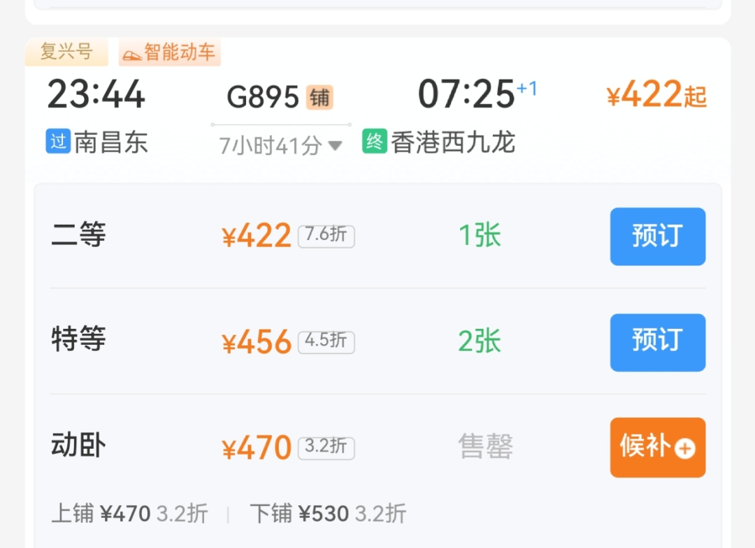 值得一提的是,新开通的动卧车票价较为优惠,其中G895次南昌至香港二等座票价为422元,特等座票价为456元,动卧470元起。此外,G896次香港西九龙至南昌东则是20:00从香港西九龙出发,23:42抵达南昌东。