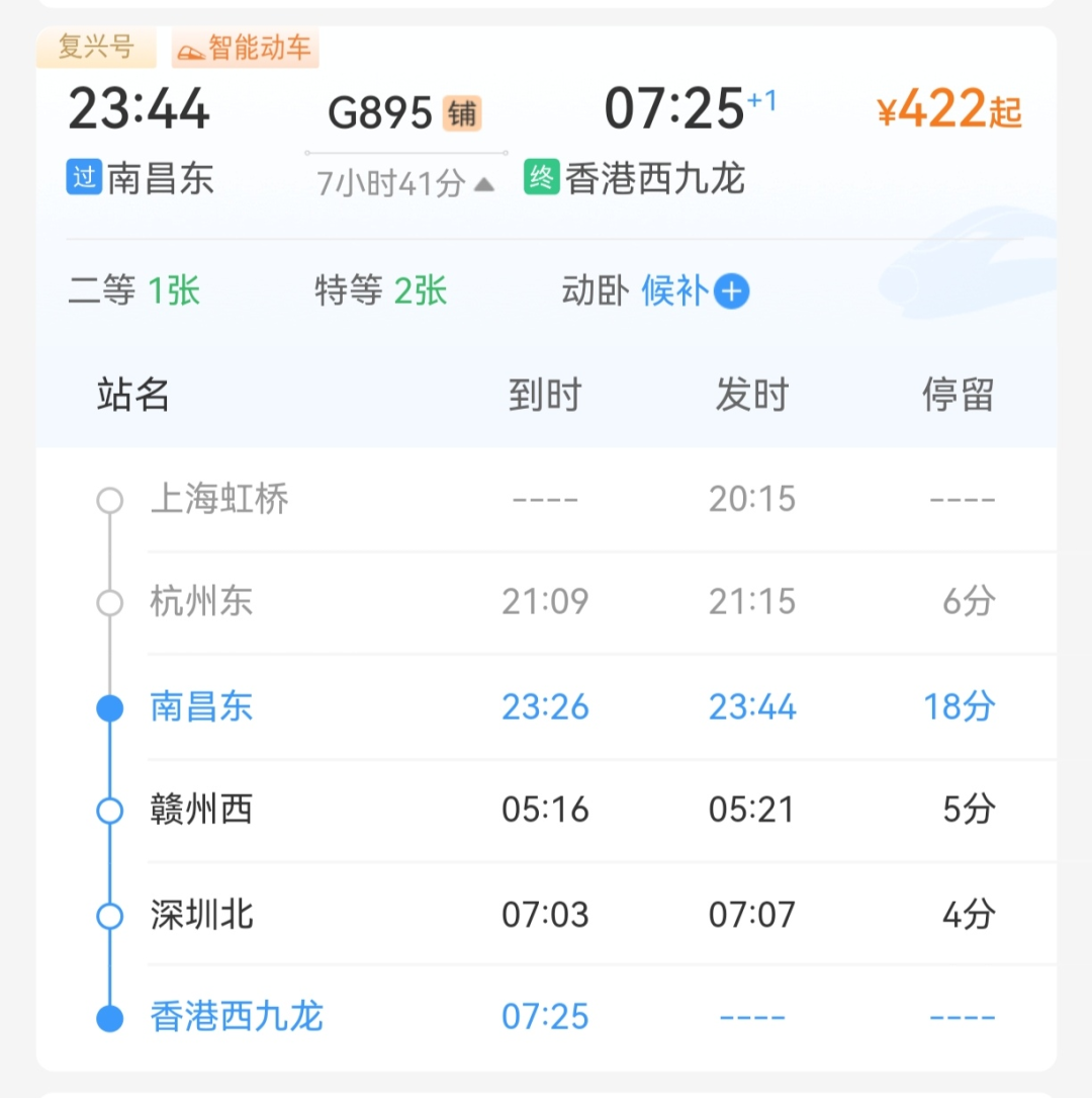 其中,上海至香港G895次列车,中途停靠南昌东、赣州西,其中南昌东23:44开车、赣州西次日05:21开车,于次日7:25抵达香港西九龙站。