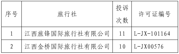 上述旅行社受到投诉主要涉及:费用纠纷、领队导游、服务质量、合同纠纷、购物纠纷、宣传招徕、行程纠纷等问题。江西省文化和旅游厅提醒广大游客、旅行社同业、在线旅游平台,请选择投诉少、服务好、信誉高的旅行社参团或合作。