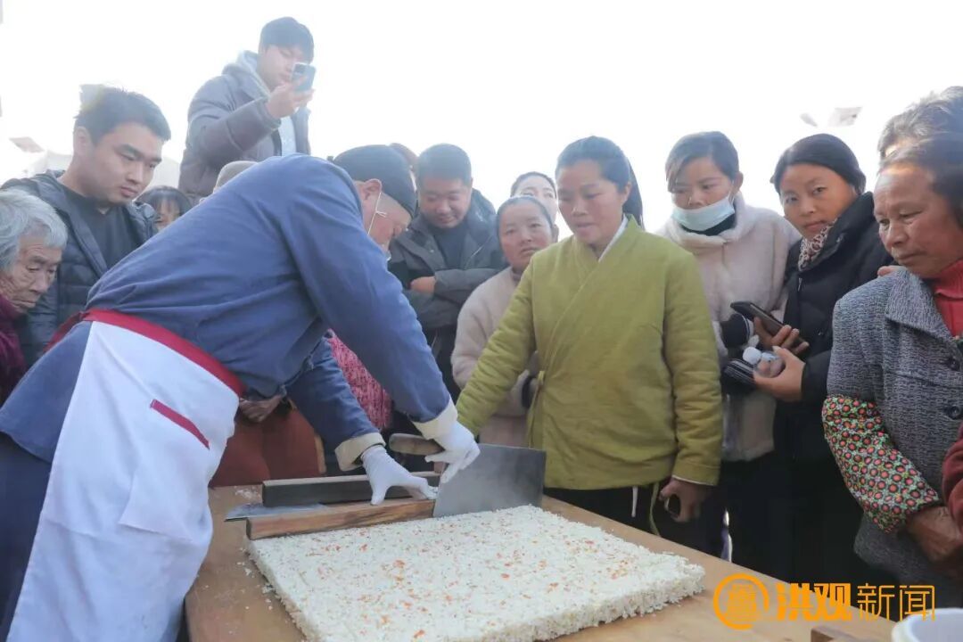 上午9时起,各地游客陆续汇聚杀猪宴现场,烧烤区、水果区、卤味区前很快排起长队,大家纷纷领取烤串、哈密瓜、甘蔗、卤鸡爪等美食。作为江西非物质文化遗产的丰城冻米糖制作区格外热门,游客们品尝着这款被誉为“江南小切”的特色小吃,纷纷赞不绝口。