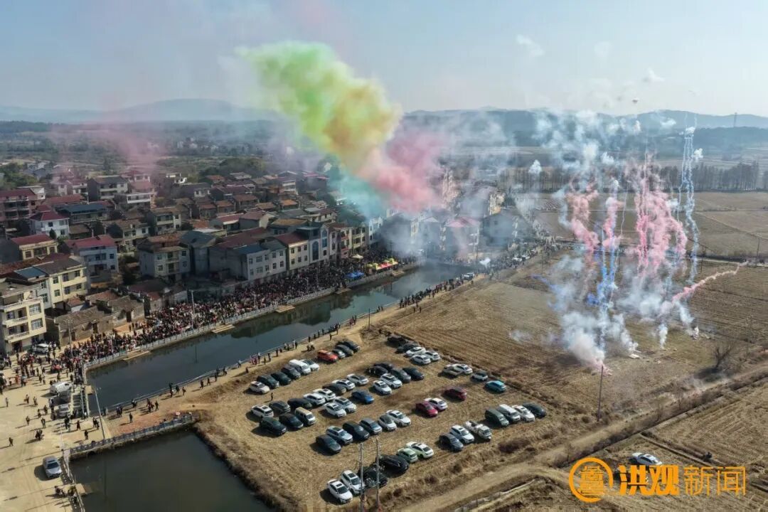 临近中午时分,现场的游客达到五千多人。随着“上菜”的口令响起,一盘盘热气腾腾的佳肴陆续端上餐桌,大家大快朵颐,高兴地吃着杀猪宴,讲述着参加活动的感受。“这么多人一起吃流水席,氛围感拉满,满满的乡村烟火气。”游客曾先生说道。用餐期间,精彩的舞狮表演与绚烂的烟花秀接连上演,将活动氛围推向高潮。