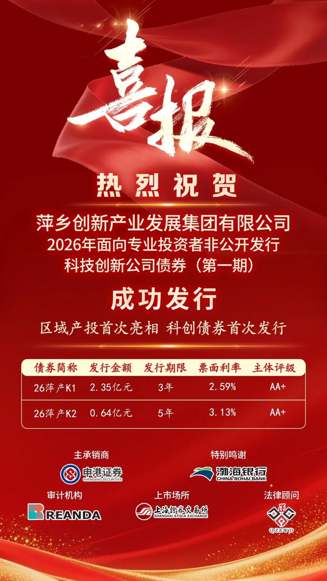 1月14日,萍乡创新产业发展集团有限公司(下简称“产发集团”)2026年面向专业投资者非公开发行科技创新公司债券(第一期)成功发行,品种一2.35亿元,期限3年,票面利率2.59%;品种二0.64亿元,期限5年,票面利率3.13%,为萍乡市首单科创债券。该债券发行为产发集团首次亮相资本市场,具有里程碑式重要意义,标志着国企转型迈出实质性步伐,将引导更多社会资本投向科技创新领域,进一步推动金融资源与科技创新深度融合。