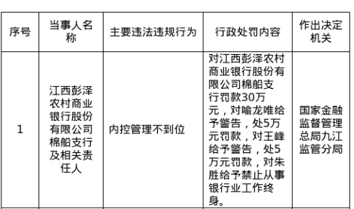 罚单显示,江西彭泽农村商业银行股份有限公司棉船支行的主要违法违规事实(案由)为:内控管理不到位。
